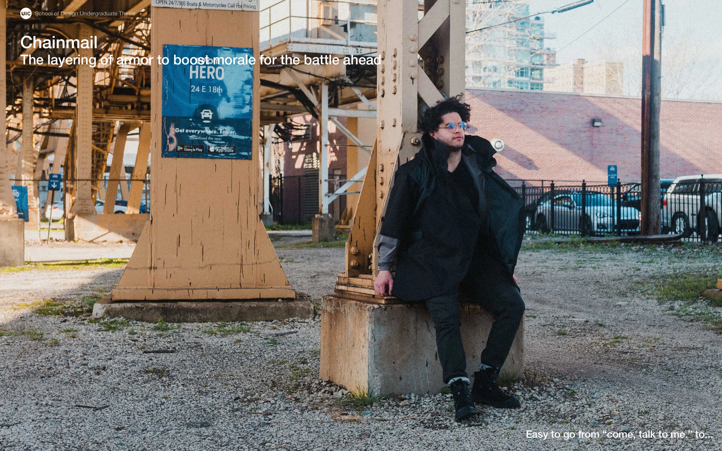 In the urban environment, there is no respite amidst a bombardment of sensorial assault. From the stench of piss; the sounds of automobiles, people, and life going on at all times; to the piling social duties we must uphold. There is no way for the urban commuter, in their busy lifestyle, to take a break in the park all the time, considering how far and few between any nature is for any one person in the concrete jungle. It’s no wonder urban dwellers are 24% more likely than their rural or suburban counterparts in accruing and mood/anxiety disorder. After many interviews and research, Bounds is a family of outerwear which allows its users to find a moment of rest amidst a panic attack by “turtling away” in the middle of a crowd. With careful consideration, Bounds allows its users to find a cozy spot no matter where they are on their travels while still fitting into societal norms as to not garner unnecessary attention.