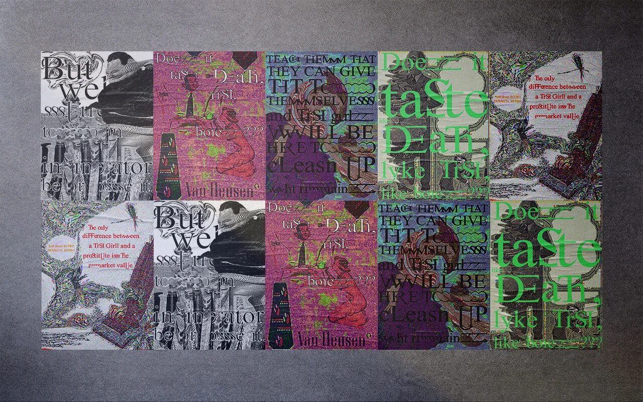 Who is a trash girl? A woman living in poverty, who is taken advantage of by men and by society. She is publicly degraded as a lesser form of woman, undeserving of respect, especially when compared to “proper” ladies. The appropriate response to this is anger, listening, and awareness in the form of a collective outcry. As a designer, I can represent the plight of these so-called trash girls in a very forthright and visceral way. Inspired by the powerful and unique vernacular essay, “TRASHGiRRRRLLLZZZ: A Manifesto for Misfit ToYZ,” by Elizabeth Broeder, I designed letterforms that, when combined with idealized images of women from the 1950s, tells a story. A story about oppression and toxic femininity that occurs to all women. In this world, misogyny is king, and we must dethrone him by force.