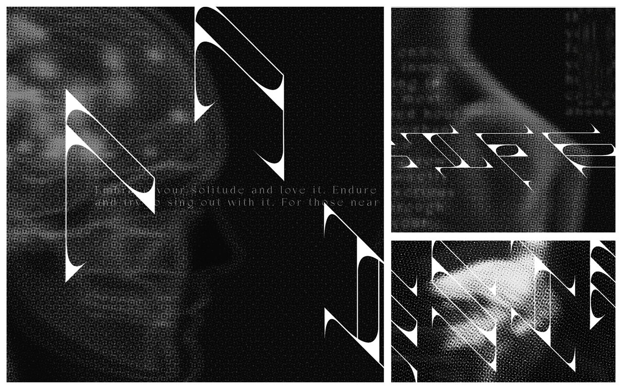As a designer, I aspire to create work that is at once poetic and pragmatic; enigmatic and straightforward. In this publication, a visual representation of my mind during a time of intense solitude is offered up to the viewer, introducing them to the fear and discomfort and the hidden beauty that lay beneath the surface. Within the dark and distorted images and forms, there is a silver lining: lovely words of intimacy and poetry stitched and distorted between the lines, so to speak. Feelings of unease transmute into tacit understanding and solace, and back again, over and over. The experience is visceral.